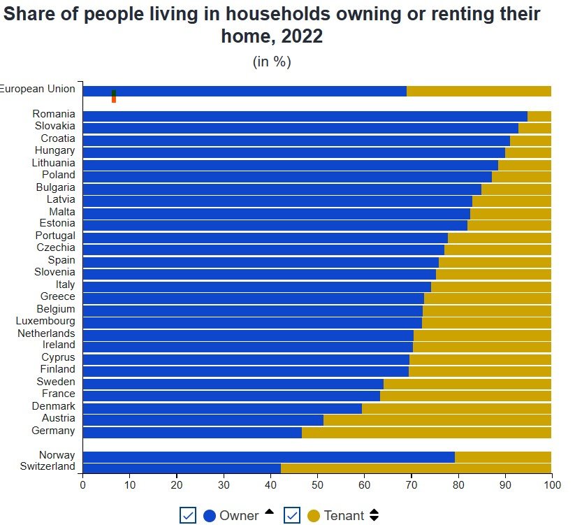 Обобщено, в целия Евросъюз 69% от хората притежават собствено жилище, докато 31% са наематели, според данните на Евростат